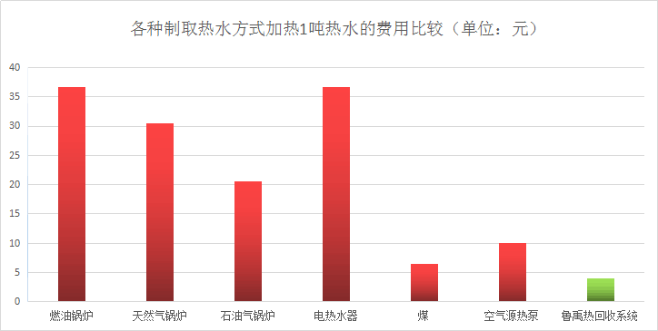 一般淋浴頭噴出洗浴熱水的溫度在40度左右,經(jīng)人體從頭到腳流到下水井的廢水溫度在35度左右,這些熱量被白白的浪費扔掉。而同樣的廢水經(jīng)過魯禹熱回收機組再排放時的溫度只有3-5度。35減去5度這就意味著有30度的熱能留在了機組里,在把14度左右的新鮮冷水引進機組里,14度加上30度等于44度,(注意!只是回收熱量不是回收水!)魯禹熱回收系統(tǒng)加熱1噸熱水的運營成本只需4度電,比電加熱節(jié)省75%以上電費,比燃煤、燃?xì)忮仩t節(jié)省50%以上運行成本。