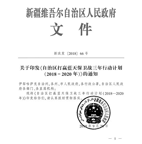 新疆維吾爾自治區(qū)人民政府發(fā)布了關(guān)于印發(fā)《自治區(qū)打贏藍(lán)天保衛(wèi)戰(zhàn)三年行動(dòng)計(jì)劃(2018-2020年)》的通知
