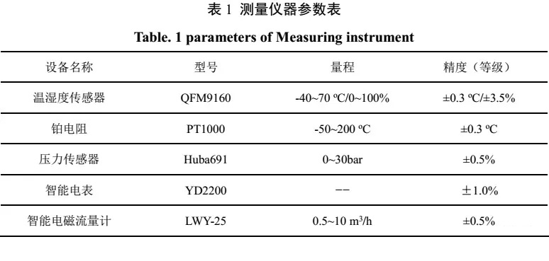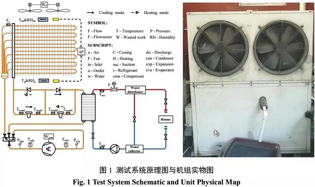 測試系統對空氣源熱泵的空氣側、制冷劑側與制取熱水側的運行參數以及能耗情況進行實時監測。測試機組原理圖與實物圖如圖1中所示,在壓縮機吸/排氣管上分別設有溫度和壓力傳感器監測壓縮機的吸/排氣溫度和壓力,在水側利用鉑電阻PT1000測量機組的進/出水溫度,利用電磁流量計測量水流量。其中主要的測量儀器參數如表1所示。