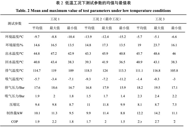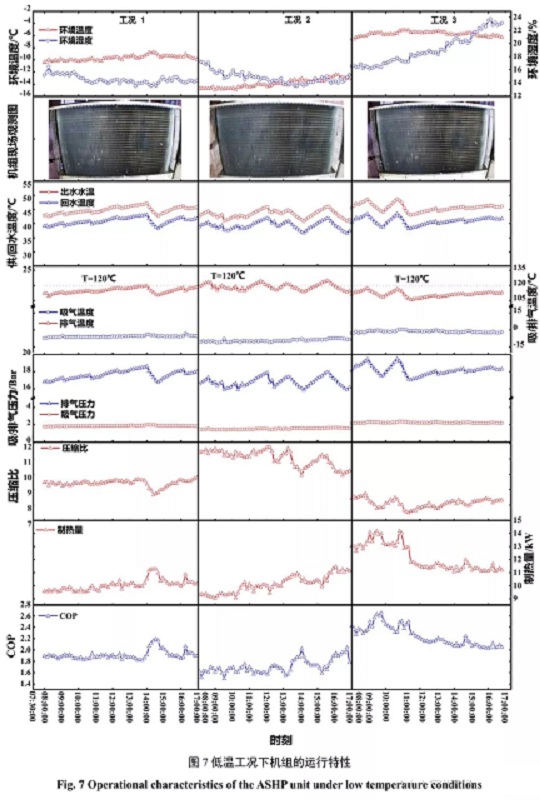 (3)最冷工況下,環境溫度均值-13.9℃,壓縮機平均排氣溫度為118.5℃,最高達到124℃,且機組有25%的時間其排氣溫度超過120℃,最高壓縮比達到11.7;運行期間機組頻繁發生“無霜除霜”的誤除霜事故以及頻繁停機的運行故障,機組的平均制熱量僅為9.9kW,COP為1.71,當溫度低至-15.2℃時,制熱量衰減幅度高達55%,COP僅為1.49。可見,低溫嚴重影響熱泵的正常運行。
