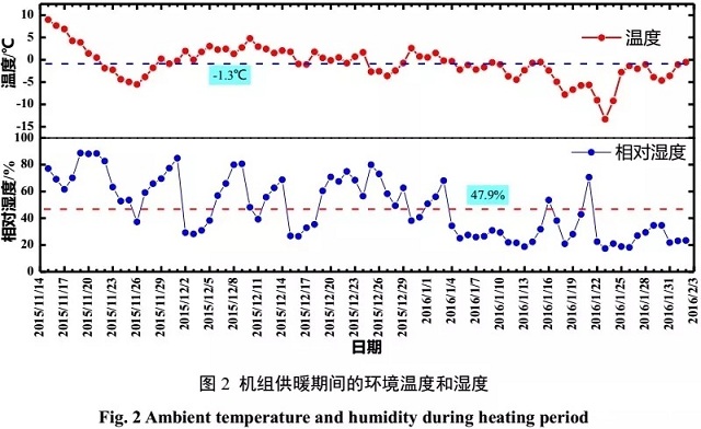 測試期為2015年11月15日至2016年2月2日。為詳細考察空氣源熱泵在測試期內的運行性能,尤其在低溫工況下的性能,全面測試了室外溫濕度,壓縮機吸排氣溫度和壓力、機組制熱量、能耗和COP等參數,并對相關的參數進行整理分析。