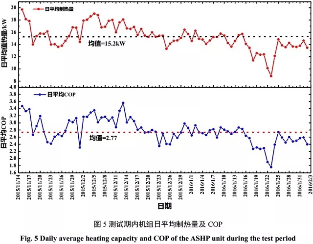 圖5為測試期內機組的日平均制熱量和日平均COP具體情況。
