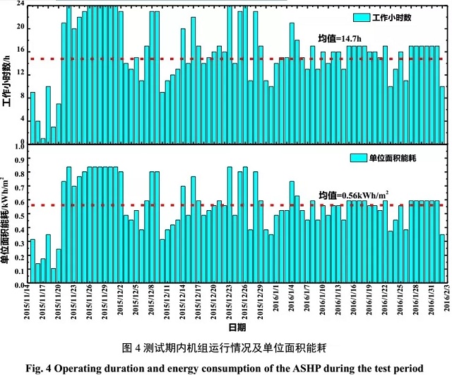 圖4為測試期內空氣源熱泵每天的運行時間和單位面積能耗。