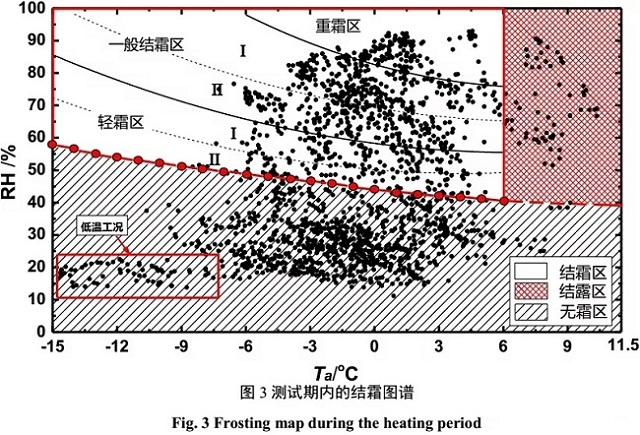 由以上結果可知,北京地區有近50%的“干冷”工況處于無霜區內,機組極易出現“無霜除霜”的誤除霜事故,而重霜區的工況則容易出現“有霜不除”的誤除霜事故[2,3],誤除霜事故會不同程度地影響機組正常運行,導致能源浪費。低溫工況位于圖譜無霜區的左下區域,低于-5℃的工況占所有工況的12.9%。可見,結霜和低溫是影響北京地區空氣源熱泵冬季運行的兩大問題。