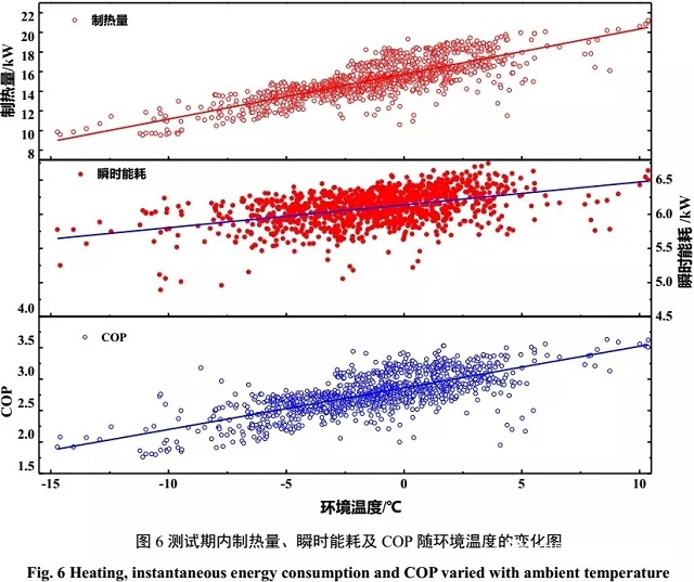 隨環境溫度上升,制熱量、瞬時能耗和COP均呈上升趨勢;由圖中散點的分布情況可知,測試機組的工況主要集中在-5~5℃的區間內,該頻段內的工況占據總工況的84.2%,平均制熱量為15.5kW,瞬時能耗為6.1kW,平均COP為2.83。