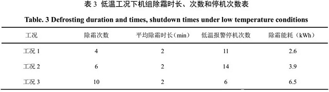 由此可見,低溫導致壓縮比超過正常范圍,對壓縮機的正常運行產生了顯著的影響。機組除霜頻次及停機故障。機組除霜時長、次數及停機故障次數如表3所示。