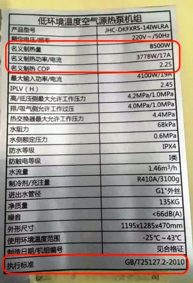 檢測標準:名義工況的制熱性能:依據GB/T25127.2規定的名義工況進行制熱性能的檢測,實測制熱量應不低于名義值的95%,實測消耗總電功率應不超過名義值的110%,實測名義工況制熱COP大于2.1。