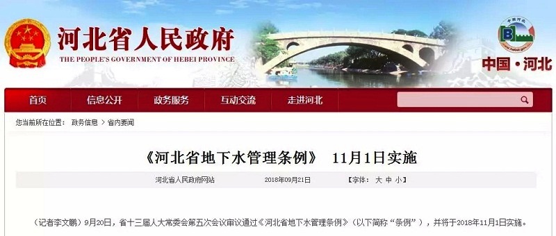 9月20日,《河北省地下水管理條例》在河北省第十三屆人民代表大會常務委員會第五次會議上獲高票通過,將于2018年11月1日實施!稐l例》規定: