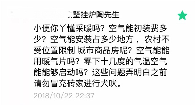 昨天發了一篇計算熱泵采暖費用的文章,一個做壁掛爐的大哥不高興了,出口成臟:“小便你丫懂采暖嗎?空氣能初裝費多少?空氣能安裝占多少地方?農村不受位置限制城市商品房昵?空氣能能用暖氣片嗎?零下十幾度的氣溫空氣能能夠啟動嗎?這些問題弄明白之前請勿冒充磚家進行犬吠!彪m然說,競品之間攻擊很正常,但是他問的問題挺有意思的,想必大家在銷售中也經常遇到,所以我們索性公開解答一下,以正視聽。