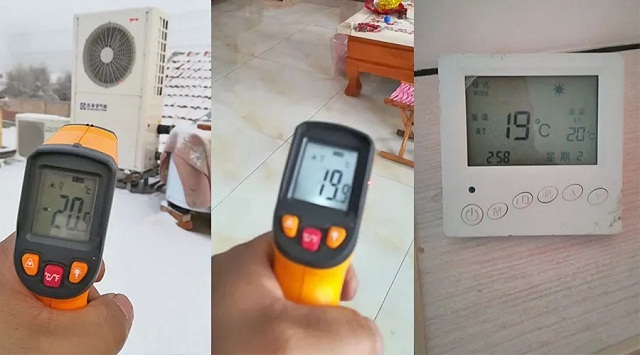 外界環境溫度—20.9℃,采用空氣源熱泵供暖,室內地暖19.9℃