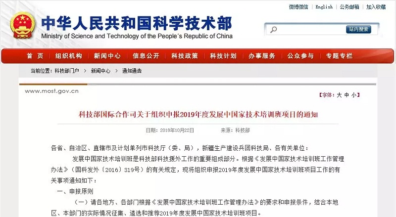 2018年9月30日,科技部國(guó)際合作司印發(fā)了《關(guān)于組織申報(bào)2019年度發(fā)展中國(guó)家技術(shù)培訓(xùn)班項(xiàng)目的通知》,指出申報(bào)重點(diǎn)技術(shù)領(lǐng)域:2019年度發(fā)展中國(guó)家技術(shù)培訓(xùn)班項(xiàng)目擬以成熟適用技術(shù)為主體,兼顧高新技術(shù)、科技政策與管理三類項(xiàng)目進(jìn)行支持。申報(bào)領(lǐng)域以農(nóng)林業(yè)、新能源與可再生能源、加工制造等領(lǐng)域?yàn)橹攸c(diǎn)。