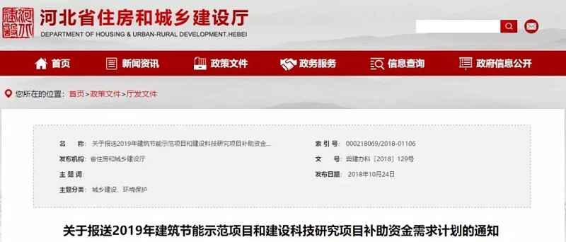 2018年10月24日,河北省住房城鄉(xiāng)建設(shè)廳辦公室印發(fā)《關(guān)于報(bào)送2019年建筑節(jié)能示范項(xiàng)目和建設(shè)科技研究項(xiàng)目補(bǔ)助資金需求計(jì)劃的通知》,指出在建筑節(jié)能示范項(xiàng)目方面,2019年省級(jí)建筑節(jié)能專項(xiàng)資金補(bǔ)助項(xiàng)目,原則上暫按《河北省建筑節(jié)能資金管理暫行辦法》(冀財(cái)建﹝2015﹞88號(hào))、《關(guān)于省級(jí)建筑節(jié)能專項(xiàng)資金使用有關(guān)問題的通知》(冀建科﹝2017﹞34號(hào))申報(bào)。其中二星級(jí)綠色建筑運(yùn)行標(biāo)識(shí)項(xiàng)目、可再生能源建筑應(yīng)用示范項(xiàng)目(空氣源熱泵項(xiàng)目)。