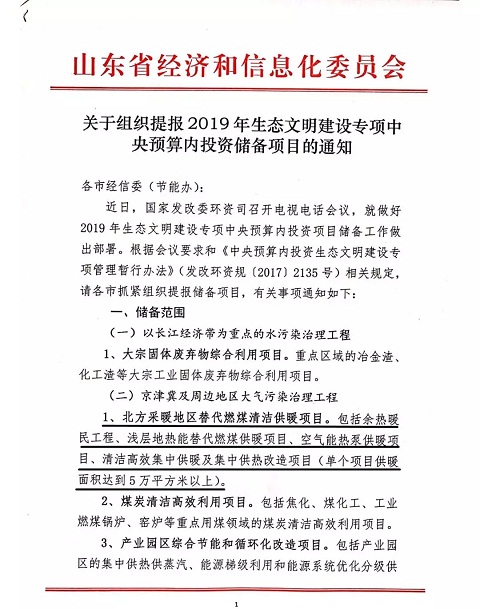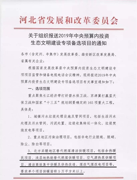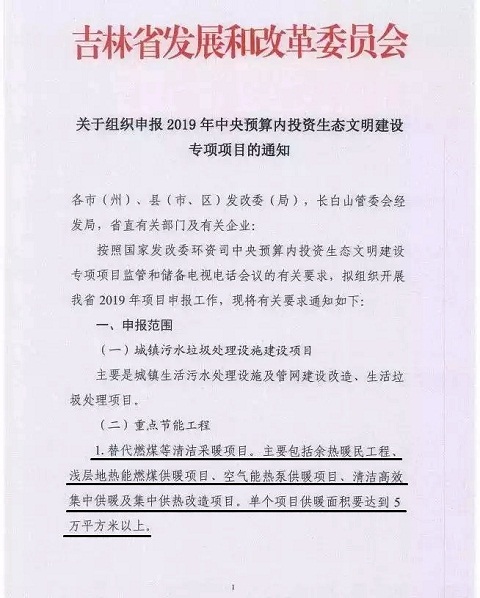 2018年7月31日,河南省發(fā)展和改革委員會(huì)印發(fā)《關(guān)于組織申報(bào)2019年中央預(yù)算內(nèi)投資生態(tài)文明建設(shè)專項(xiàng)備選項(xiàng)目的通知》,指出專項(xiàng)備選重點(diǎn)為北方采暖地區(qū)替代燃煤清潔供暖項(xiàng)目,主要包括余熱暖民工程、淺層地?zé)崮芴娲济汗┡?xiàng)目,空氣源熱泵供暖項(xiàng)目,清潔高效集中供暖及集中供熱改造項(xiàng)目,單個(gè)項(xiàng)目的供暖面積要達(dá)到5萬平方米以上。