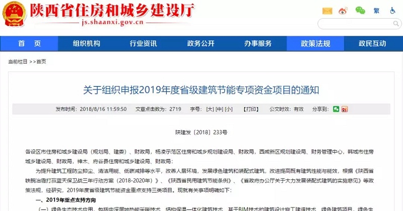 2018年8月15日,陜西省住房和城鄉(xiāng)建設(shè)廳、陜西省財(cái)政廳印發(fā)《關(guān)于組織申報(bào)2019年度省級(jí)建筑節(jié)能專項(xiàng)資金項(xiàng)目的通知》,指出2019年度省級(jí)建筑節(jié)能資金重點(diǎn)支持綠色生態(tài)技術(shù)應(yīng)用項(xiàng)目,包括中深層地?zé)崮懿膳夹g(shù)等,綠色生態(tài)城區(qū)建設(shè)試點(diǎn)示范;建筑能效提升,包括農(nóng)村建筑節(jié)能改造技術(shù)、農(nóng)村清潔能源取暖技術(shù)、低能耗建筑技術(shù);技術(shù)集成創(chuàng)新,上述兩個(gè)類別項(xiàng)目實(shí)施中,聚焦新技術(shù)新產(chǎn)品推廣所面臨的問題,同步開展工程應(yīng)用研究的項(xiàng)目。申請(qǐng)“先建后補(bǔ)、以獎(jiǎng)代補(bǔ)”等方式的綠色建筑項(xiàng)目、省級(jí)建筑節(jié)能資金支持項(xiàng)目,應(yīng)嚴(yán)格按照經(jīng)審查的工程方案、申報(bào)方案進(jìn)行施工并完成全部技術(shù)內(nèi)容且竣工驗(yàn)收合格。