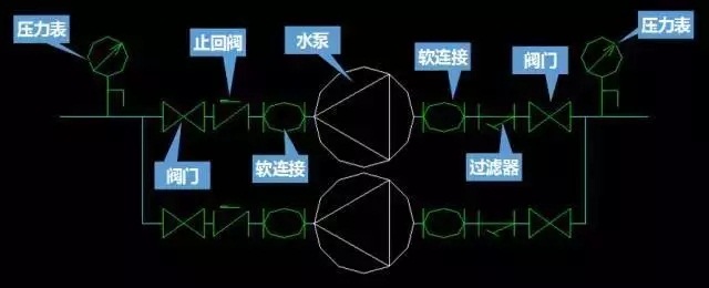 (出水側(cè))閥門—止回閥—軟連接—水泵—軟連接—Y型過濾器—閥門(進水側(cè))