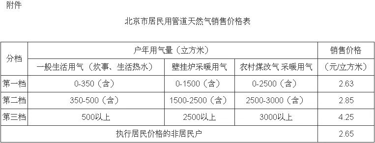 據北京市發改委,經過調整后,居民用氣價格具體為:第一檔為每立方米2.63元,第二檔為2.85元,第三檔為4.25元。