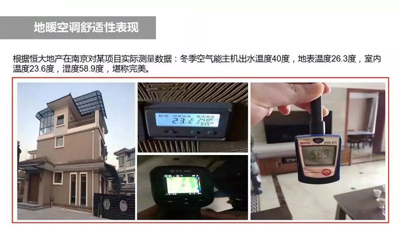 恒大地產(chǎn)在南京對某項目進行了實際測量,得出地暖空調(diào)運行時室內(nèi)的溫濕度數(shù)據(jù):冬季空氣能主機出水溫度40℃,地表溫度26.3℃,室內(nèi)溫度23.6℃、濕度58.9℃,可以說是非常舒適的生活環(huán)境,深刻體現(xiàn)了地暖空調(diào)的舒適性。