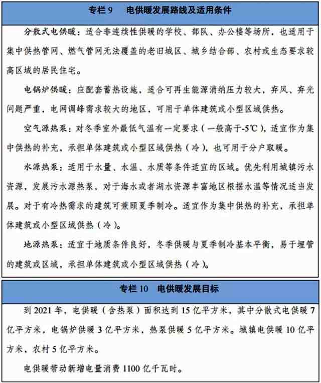 根據(jù)2017年12月5日,國(guó)家發(fā)展改革委等十部門聯(lián)合印發(fā)的《北方地區(qū)冬季清潔取暖規(guī)劃(2017-2021年)》,明確指出電供暖是利用電力,使用電鍋爐等集中式供暖設(shè)施或分散式電供暖設(shè)施,以及各類電驅(qū)動(dòng)熱泵,向用戶供暖的方式,布置和運(yùn)行方式靈活,有利于提高電能占終端能源消費(fèi)的比重。結(jié)合采暖區(qū)域的熱負(fù)荷特性、環(huán)保生態(tài)要求、電力資源、電網(wǎng)支撐能力等因素,因地制宜發(fā)展電供暖。