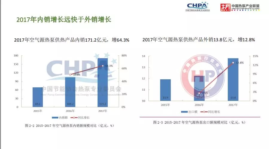 補充一點,2017年我國空氣源熱泵供熱產業實現了高速增長,主要源于內銷市場的拉動,2017年空氣源熱泵供熱產品內銷171.2億元,內銷增長幅度為64.3%,2017年空氣源熱泵供熱產品外銷13.8億元,外銷增長幅度為12.8%,主要是內銷增長拉動整個行業的增長。