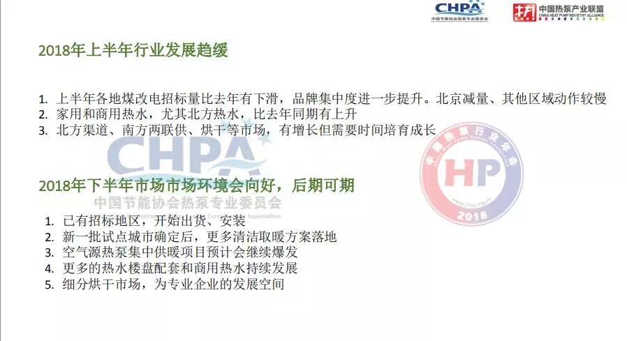 2017年我國空氣源熱泵供熱產業取得非常好的成績,但是在2018年上半年行業發展趨緩,整機制造企業壓力非常大,源于2018年上半年煤改電的招標總量與去年相比有所下降,品牌的集中度迅速提高。具體北京地區冬季清潔取暖工程空氣源熱泵產品市場需求量比去年有所降低,河北、山東、山西等其他區域工作開展比較慢,且市場比較分散,給空氣源熱泵整機企業帶來非常大的壓力。但2018年后半年市場環境會向好,市場前景依然可期。尤其是北方地區清潔取暖新一批試點城市公布之后,更多的清潔取暖方案將落地。此外,空氣源熱泵集中供暖項目在2018年后半年也將迎來市場旺季,集中供暖市場將為商用低溫空氣源熱泵機組等產品帶來市場會在后半年持續爆發。在生活熱水領域,越來越多的精裝樓盤選擇使用空氣源熱泵產品實現生活熱水的配套,還有就是細分的烘干市場,如淤泥、煙業的烘干市場都將為專業空氣源熱泵企業提供良好的細分的發展空間。