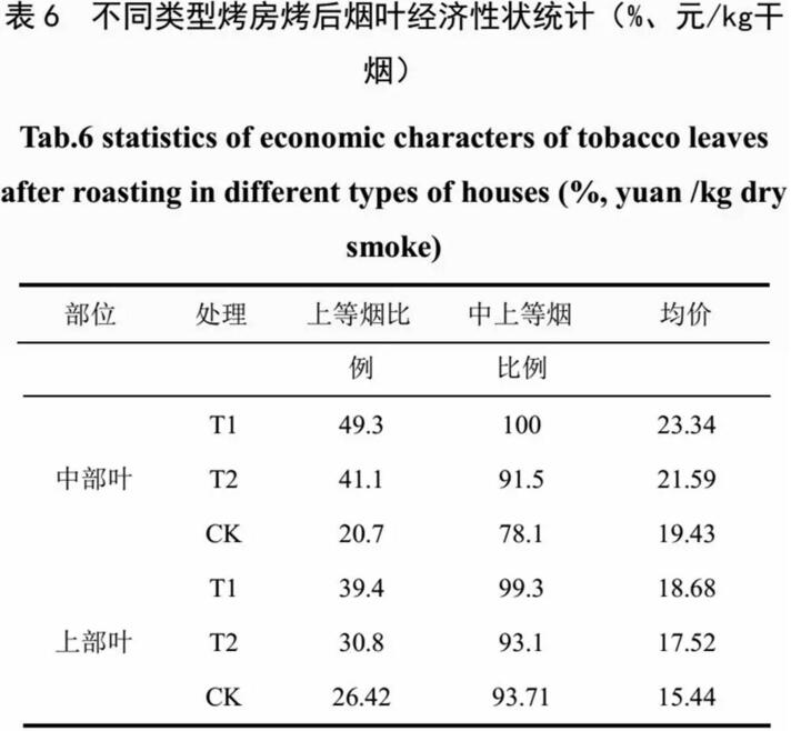 從表6可以看出,處理T1烤后煙葉的上等煙葉比例、中上等煙葉比例和均價(jià)最高,對(duì)照最低,處理T2除上部葉中上等煙比例比對(duì)照CK略低,其余指標(biāo)均高于對(duì)照CK,低于處理T1。其中處理T1中部葉分別比對(duì)照提高了28.6%、21.9%和3.91元/kg干煙,比處理T2提高了8.2%、8.5%和1.75元/kg干煙;上部葉葉分別比對(duì)照提高了12.98%、5.59%和3.24元/kg干煙,比處理T2提高了8.6%、6.2%和1.16元/kg干煙。