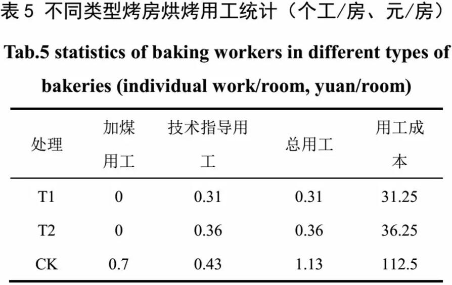 從表5可知,不同處理烘烤用工成本以對(duì)照CK最高,為112.5元/房;以處理T1最低,為31.25元/房;處理T2居中,為36.25元。分析比較用工構(gòu)成,可明顯看出,處理T1和T2與對(duì)照CK相比,技術(shù)指導(dǎo)用工相差不大;處理T1和T2比對(duì)照CK缺少了加煤用工環(huán)節(jié),而加煤用工在對(duì)照CK總用工量中占有較大比例,因此導(dǎo)致總用工量和成本明顯降低,其中用工成本比對(duì)照CK減少了76.25-81.25元/房。處理T2烘烤時(shí)間比處理T1長(zhǎng)1天,所以用工成本相對(duì)較高。
