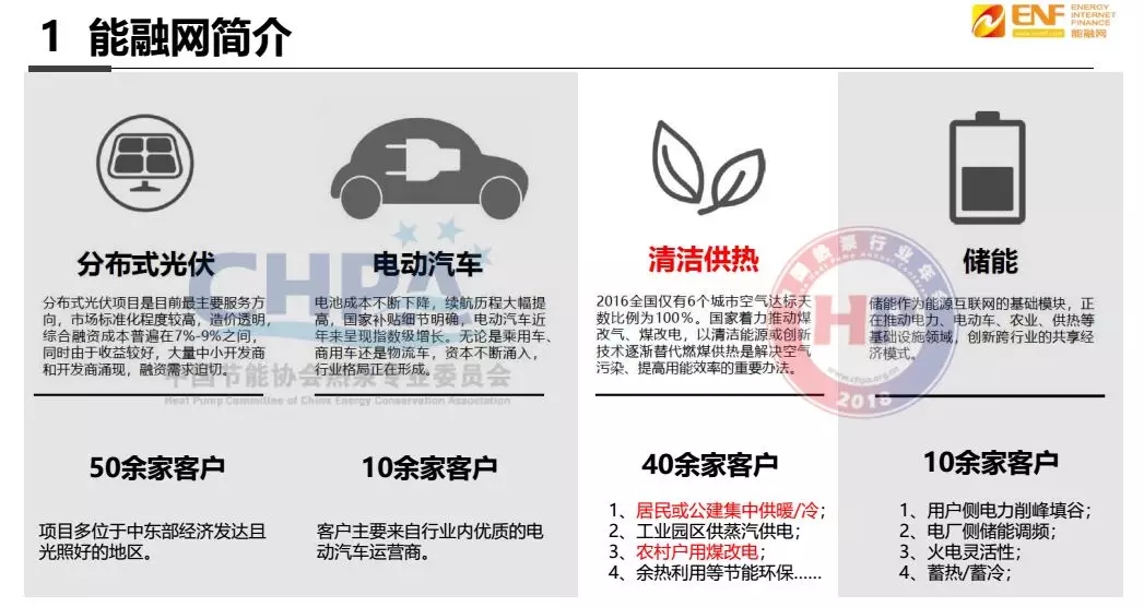 能融網(wǎng)是一個專門針對綠色能源的投融資服務(wù)平臺,服務(wù)范圍包含分布式光伏、電動汽車、清潔供熱、儲能四大領(lǐng)域。自2017年初,我們開始關(guān)注清潔供熱領(lǐng)域,主要分為工業(yè)供熱和居民供熱兩個方向。工業(yè)園區(qū)供熱是最早突破的領(lǐng)域,不過隨著近幾年來“煤改電”的發(fā)展,我們的重點(diǎn)開始轉(zhuǎn)向了居民供熱。