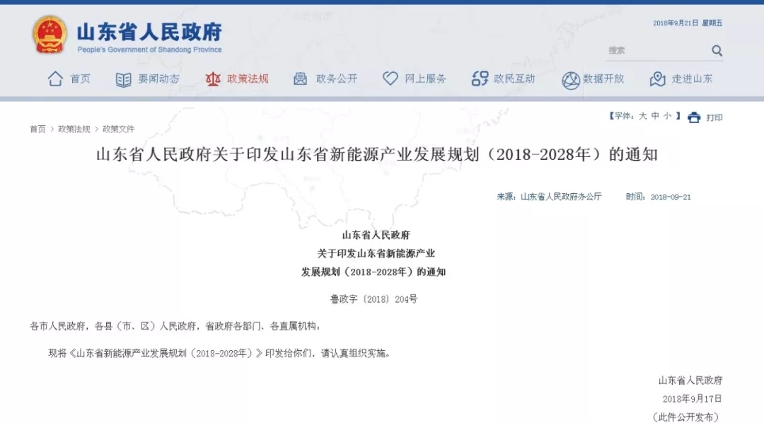 2018年9月21日,山東省人民政府發布《山東省新能源產業發展規劃(2018-2028年)》,指出新能源產業規模不斷壯大。到2022年,山東省新能源產業總產值力爭達到7000億元,產業增加值力爭達到2400億元。到2028年,新能源產業總產值、增加值力爭分別達到12000億元和4000億元,成為山東省新的重要支柱產業。